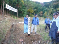 11月20日、この秋一番の澄み切った青空のもと、鳥取市の森林公園「とっとり出合いの森」わがクラブ担当「いなばの森」におきまして、昨年に続き遊歩道の設置と植樹を行いました。参加者は、クラブ会員29名、出合いの森より応援2名に、県の森林・林務総室の大北室長さんも、“白うさぎ大使認定カード”を会員全員分持参の上ご参加頂きました。昨年に続いて2回目のせいか要領よく作業はすすみ、2時間もすると遊歩道はほぼ完成。後半は遊歩道仕上げグループと植樹グループに分かれ、植樹組は、ツツジ、川津桜、ソメイヨシノ、ヤマホウシなど180本の樹木を1時間半ほどで植えきってしまいました。来年の春には、遊歩道を散策しながら、サクラがきれいに咲くのを楽しむことができるでしょう。