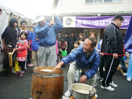 12月4日(日)、会員27名、鳥取城北高校相撲部11名、鳥取環境大学陸上部7名、田中鉄工所の中国人研修生4名、こども学園の職員の皆さんと、子供たちで、今年もにぎやかにもちつきを行いました。今年は大会の関係で相撲部員の数が少なかったのですが、さすが、今年の全国大会を個人、団体とも総なめしただけあって、いつもの時間には、すっかりつきあがり、片付ける頃にザーッと雨が降りだすといういいタイミング。交流会は体育館で開かれ、出来たてのぜんざいやきなこ餅、それに加えてこども学園の職員の方の心づくしの煮物をおいしく頂きながら、会話も弾みました。県外出身者の多い環境大学陸上部の皆さんも「毎年、この煮物を楽しみにしている。」と笑顔で話してくれました。来年は、陸上部の皆さんも、優勝できるよう頑張ってくださいね。
