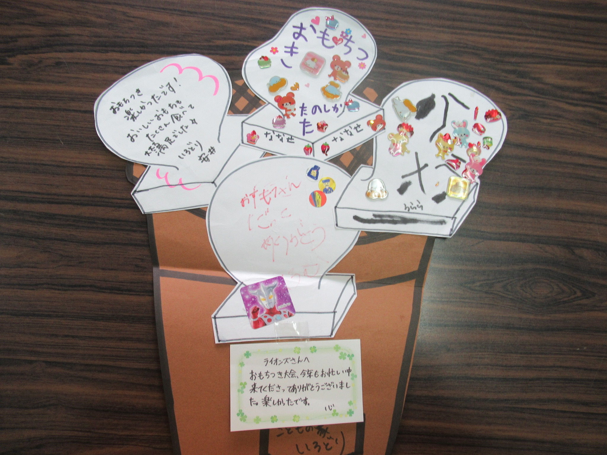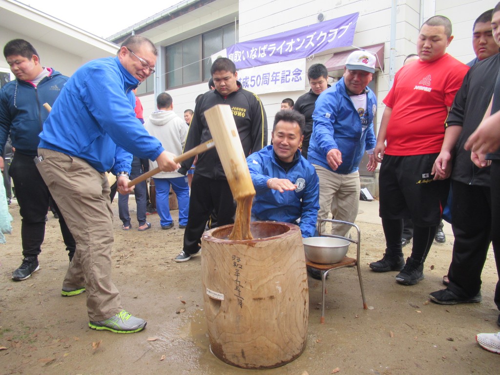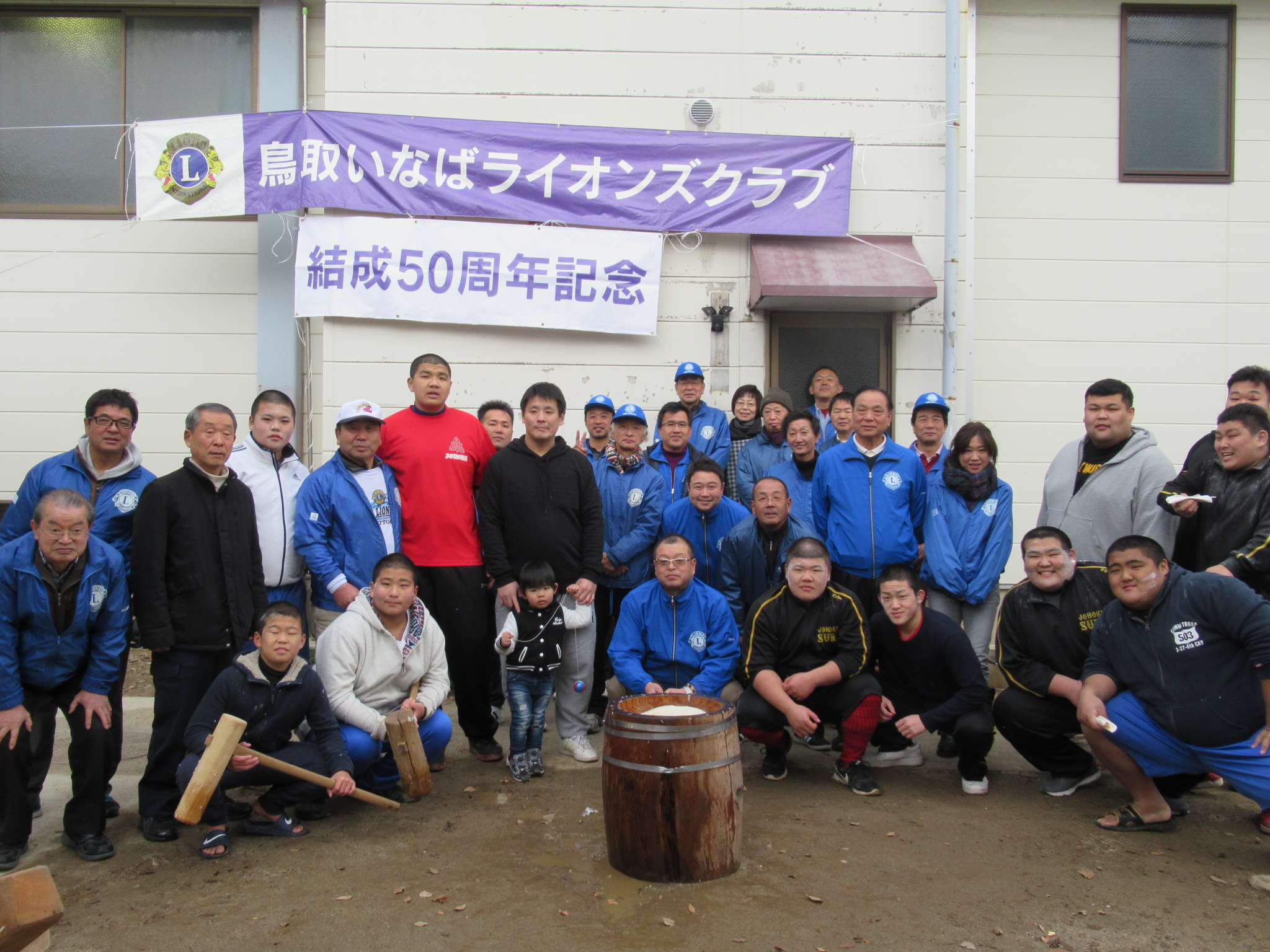 12月10日(日)、肌寒い中、今年で45回目となる鳥取こども学園もちつき大会を今年は結成50周年記念事業の一つとして開催致しました。会員30名、鳥取こども学園の先生・児童40名、そして、今年も鳥取城北高校・鳥取西中相撲部、コーチ合わせて34名に友情参加いただき、賑やかに盛大に開催致しました。もちつきが始まると相撲部の皆さんの抜群のチームワークで、どんどんもちがつきあがります。学園の先生や児童の皆さんは、つきあがったもちをこねる役で、もちとり粉で顔中真っ白になりながら、奮闘するお子さんの姿も毎年恒例。ライオンズメンバーはこね役を除いて、これまた恒例でセイロ蒸しの担当。そして、お楽しみはつきたてほやほやのもちをあんこもちや、きな粉もち、栃もち、ぜんざいにしていただくこと。日頃、そんなに食べない人でも7つくらいペロッと食べてしまいます。今年は天候にも恵まれ、相撲部の皆さんの多くのご参加で、段取りよく終了。今年もこどもたちの笑顔がはじける楽しいもちつき大会となりました。後日、鳥取こども学園より、こどもさんの折り紙つきの可愛いお礼状が届きました。